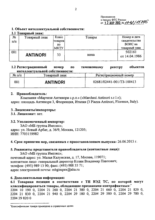 "О ТОВАРНОМ ЗНАКЕ "ANTINORI"