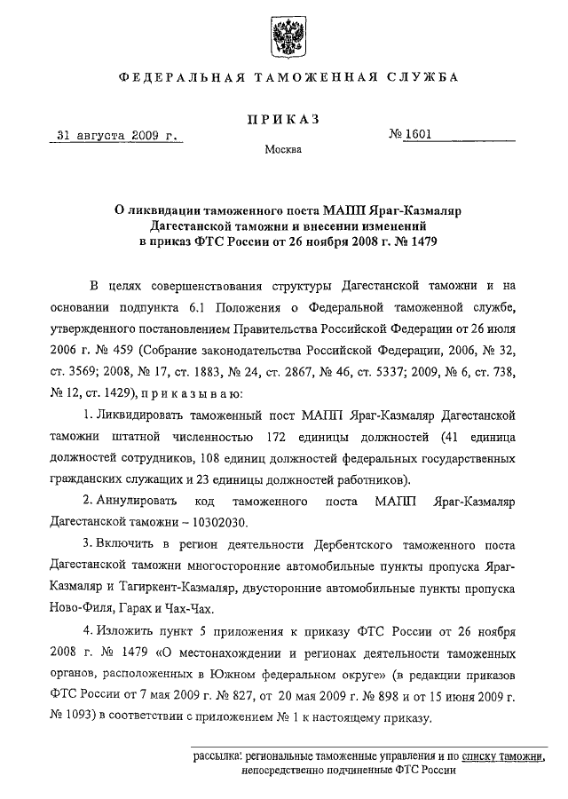 "О ЛИКВИДАЦИИ ТАМОЖЕННОГО ПОСТА МАПП ЯРАГ-КАЗМАЛЯР ДАГЕСТАНСКОЙ ТАМОЖНИ И ВНЕСЕНИИ ИЗМЕНЕНИЙ В ПРИКАЗ ФТС РОССИИ ОТ 26 НОЯБРЯ 2008 Г. N 1479"