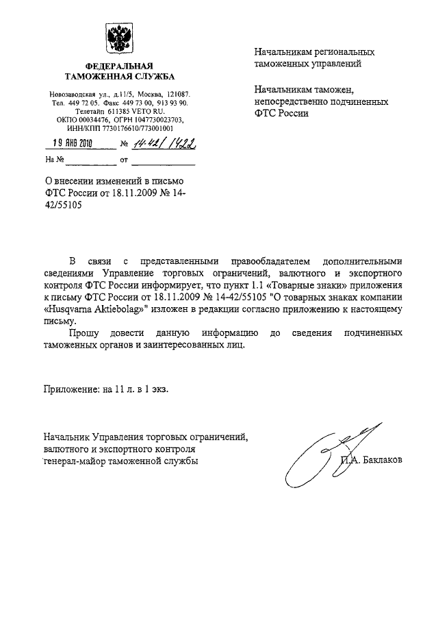 "О ВНЕСЕНИИ ИЗМЕНЕНИЙ В ПИСЬМО ФТС РОССИИ ОТ 18.11.2009 N 14-42/55105"