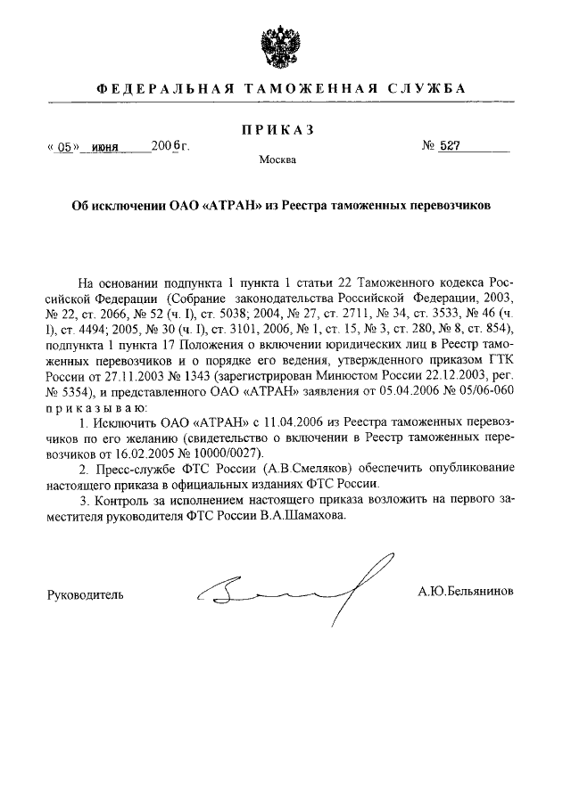 "ОБ ИСКЛЮЧЕНИИ ОАО "АТРАН" ИЗ РЕЕСТРА ТАМОЖЕННЫХ ПЕРЕВОЗЧИКОВ"