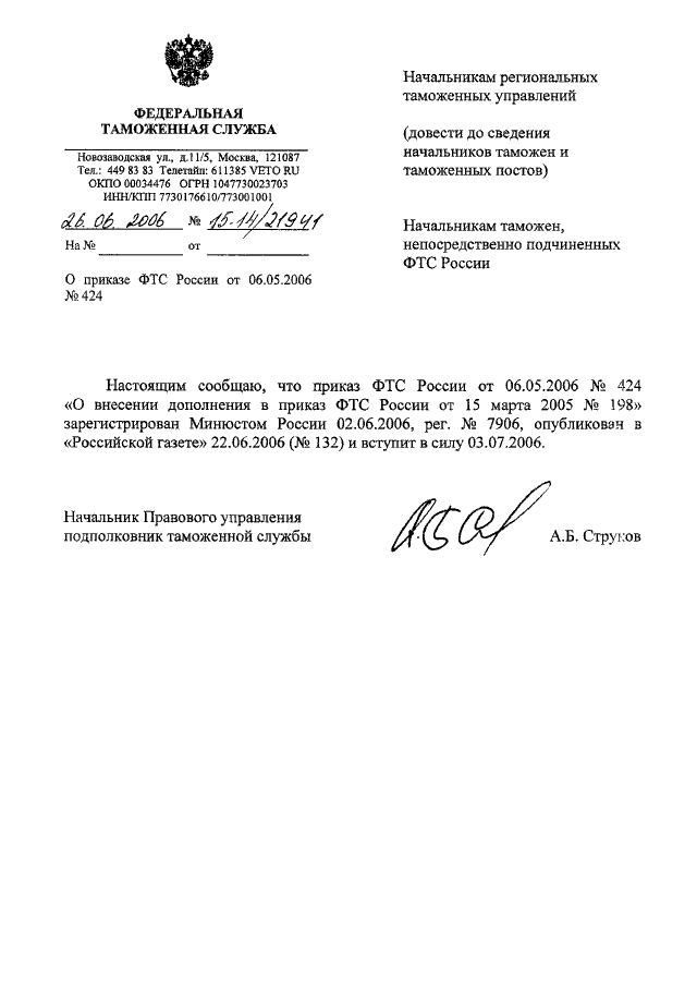 "О ПРИКАЗЕ ФТС РОССИИ ОТ 06.05.2006 N 424"