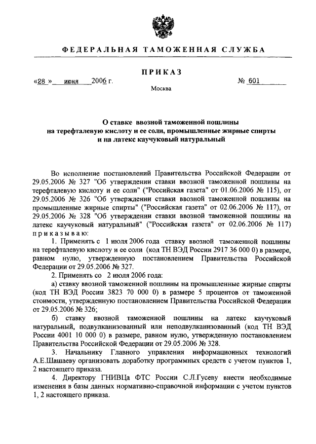 ПРИКАЗ ФТС РФ от 28.06.2006 N 601