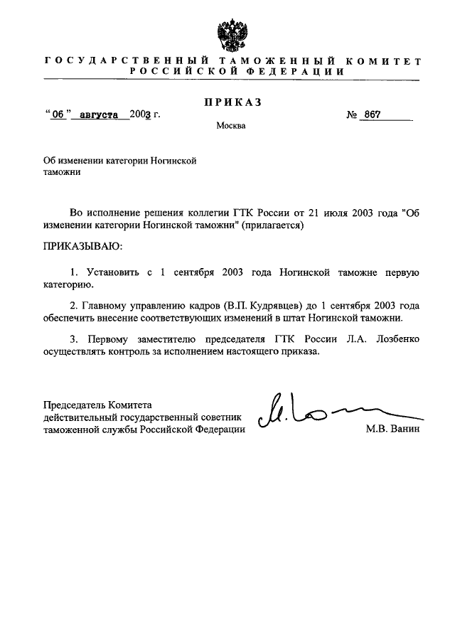 ПРИКАЗ ГТК РФ от 06.08.2003 N 867