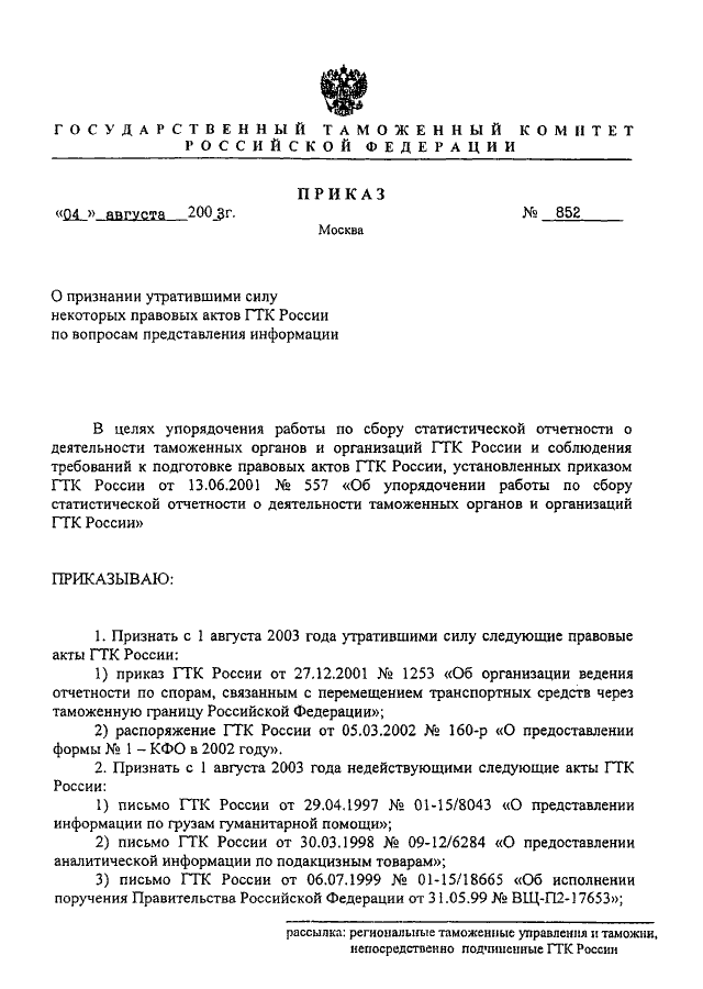 ПРИКАЗ ГТК РФ от 04.08.2003 N 852
