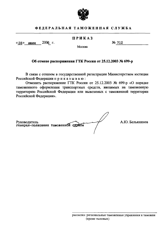 ПРИКАЗ ФТС РФ от 28.07.2006 N 712