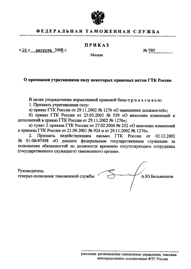 ПРИКАЗ ФТС РФ от 18.08.2006 N 787