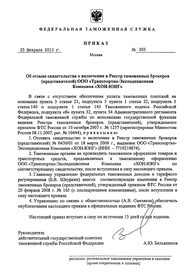 "ОБ ОТЗЫВЕ СВИДЕТЕЛЬСТВА О ВКЛЮЧЕНИИ В РЕЕСТР ТАМОЖЕННЫХ БРОКЕРОВ (ПРЕДСТАВИТЕЛЕЙ) ООО "ТРАНСПОРТНО - ЭКСПЕДИЦИОННАЯ КОМПАНИЯ "ХОН-ЮНГ"