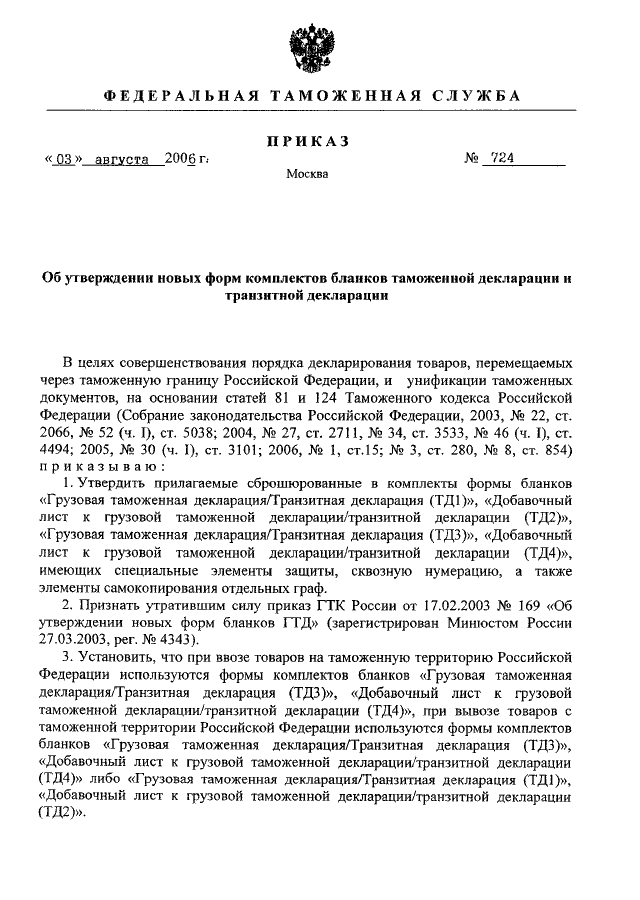 ПРИКАЗ ФТС РФ от 03.08.2006 N 724
