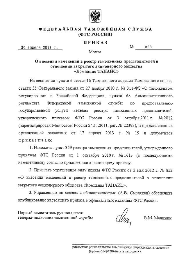 ПРИКАЗ ФТС РФ от 30.04.2013 N 863