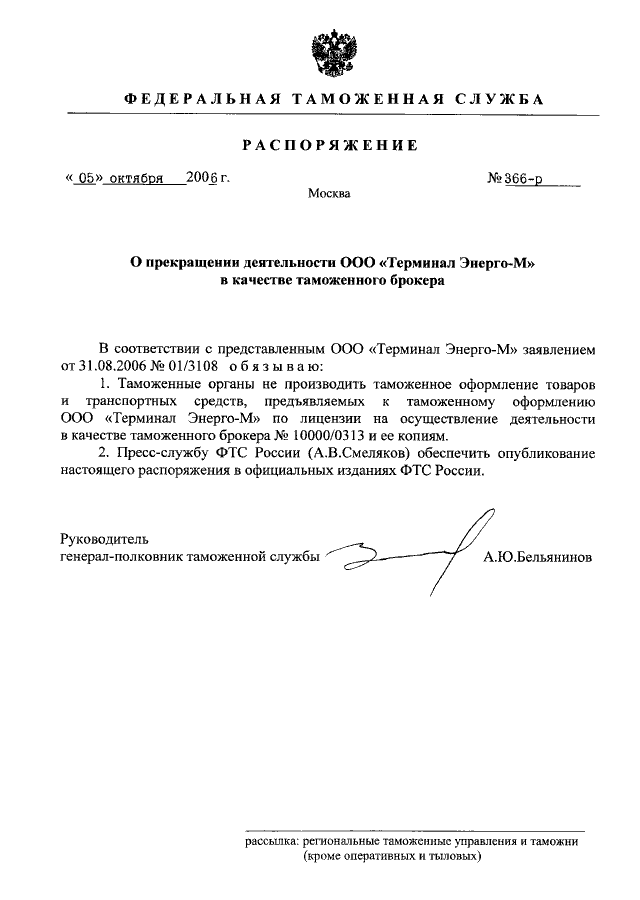 РАСПОРЯЖЕНИЕ ФТС РФ от 05.10.2006 N 366-р
