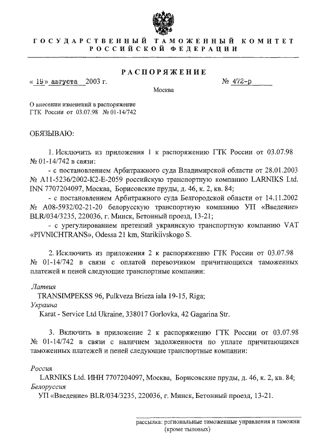 РАСПОРЯЖЕНИЕ ГТК РФ от 19.08.2003 N 472-р