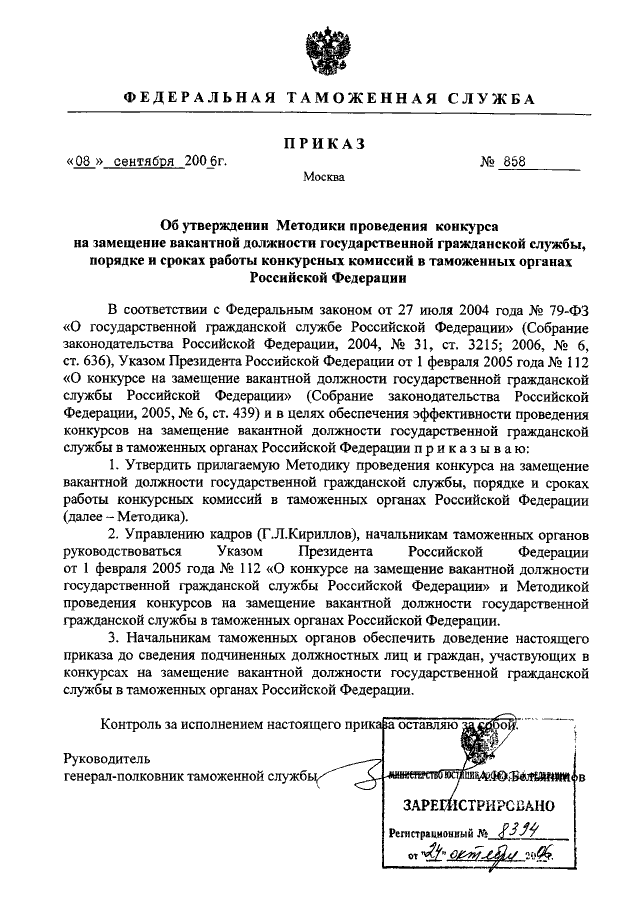 ПРИКАЗ ФТС РФ от 08.09.2006 N 858