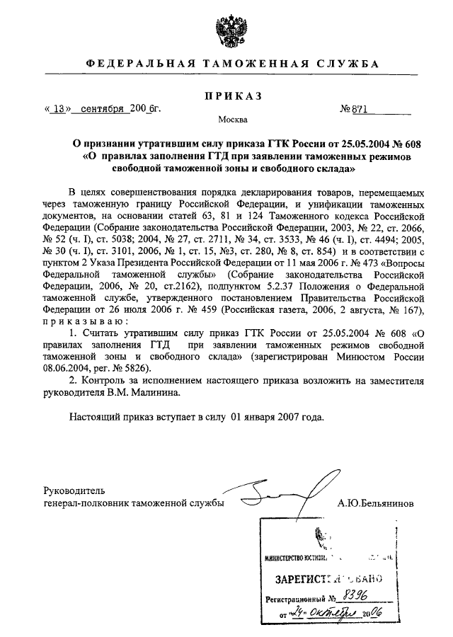 ПРИКАЗ ФТС РФ от 13.09.2006 N 871 "О ПРИЗНАНИИ УТРАТИВШИМ СИЛУ ПРИКАЗА ГТК РОССИИ ОТ 25.05.2004
