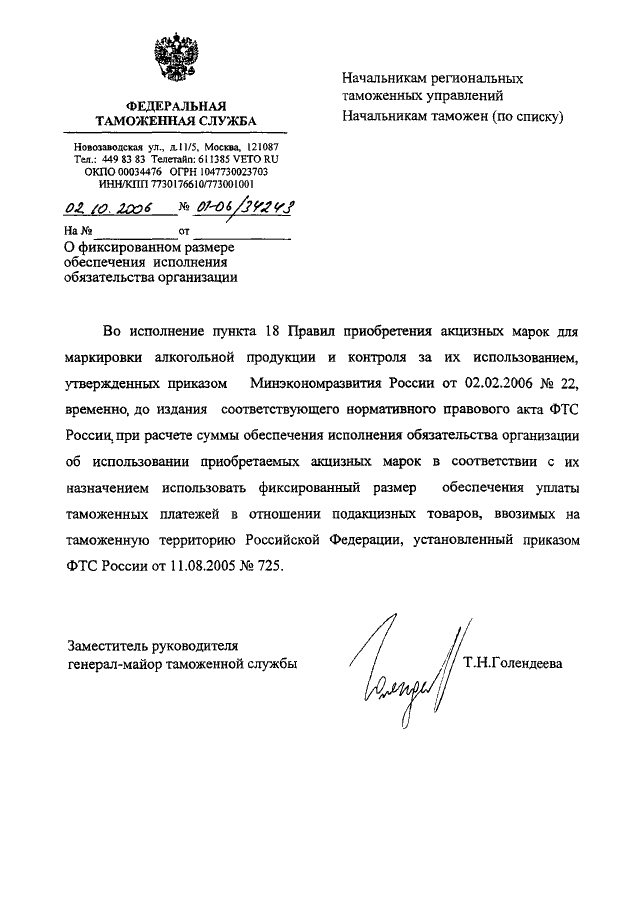 ПИСЬМО ФТС РФ от 02.10.2006 N 01-06/34243