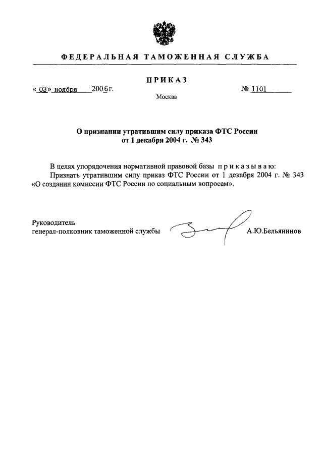 ПРИКАЗ ФТС РФ от 03.11.2006 N 1101