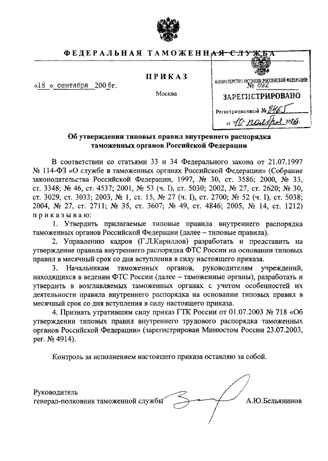 ПРИКАЗ ФТС РФ от 18.09.2006 N 892