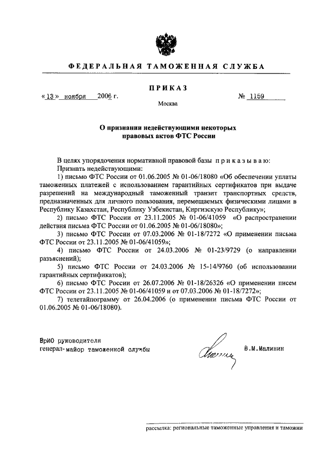 ПРИКАЗ ФТС РФ от 13.11.2006 N 1159