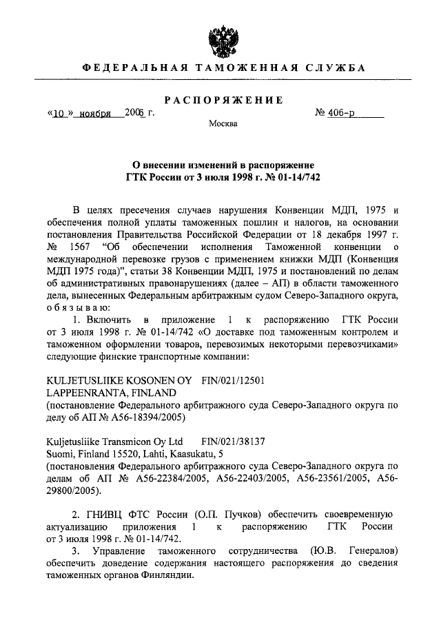 РАСПОРЯЖЕНИЕ ФТС РФ от 10.11.2006 N 406-р