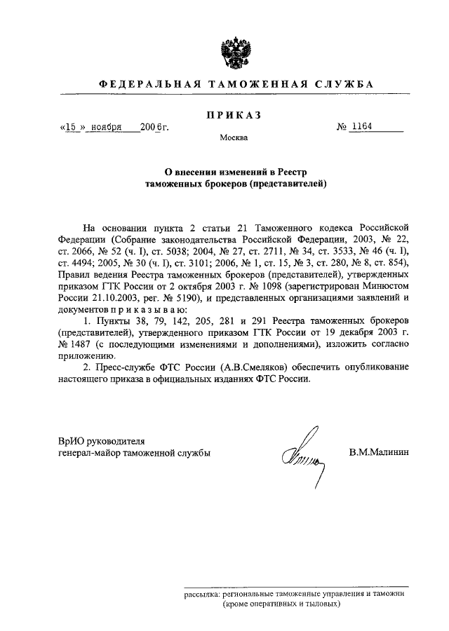ПРИКАЗ ФТС РФ от 15.11.2006 N 1164