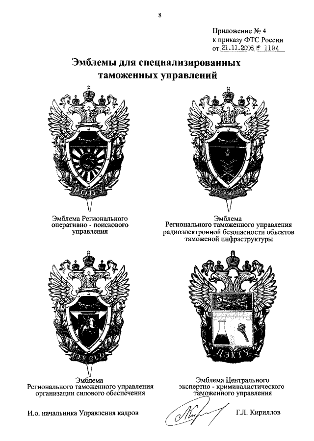 "ОБ УЧРЕЖДЕНИИ ГЕРАЛЬДИЧЕСКИХ ЗНАКОВ - ЭМБЛЕМ И УТВЕРЖДЕНИИ РИСУНКОВ, ОПИСАНИЙ ЭМБЛЕМ ДЛЯ СТРУКТУРНЫХ ПОДРАЗДЕЛЕНИЙ ФТС РОССИИ, РЕГИОНАЛЬНЫХ ТАМОЖЕННЫХ УПРАВЛЕНИЙ И ПОДЧИНЕННЫХ ИМ ТАМОЖЕН, ТАМОЖЕН, НЕПОСРЕДСТВЕННО ПОДЧИНЕННЫХ ФТС РОССИИ, И УЧРЕЖДЕНИЙ, НАХОДЯЩИХСЯ В ВЕДЕНИИ ФТС РОССИИ"