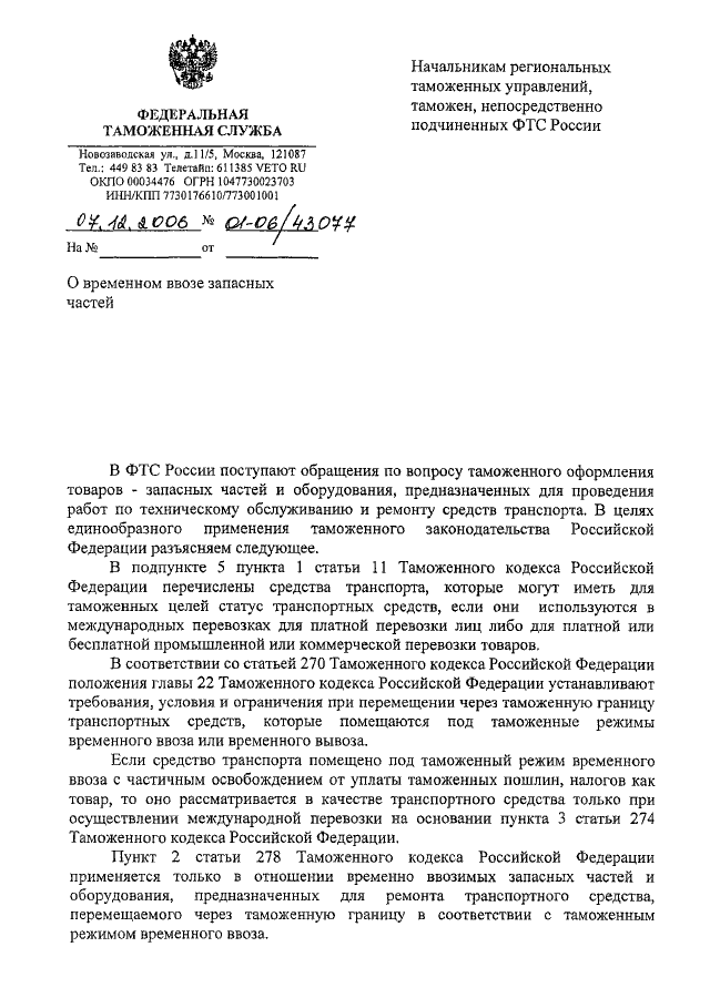 ПИСЬМО ФТС РФ от 07.12.2006 N 01-06/43077