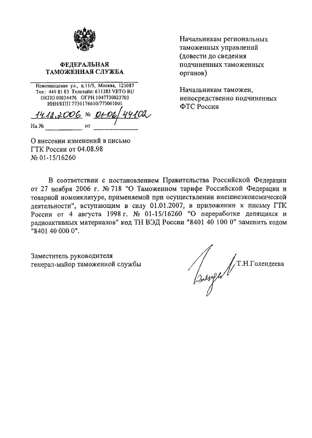 ПИСЬМО ФТС РФ от 14.12.2006 N 01-06/44102