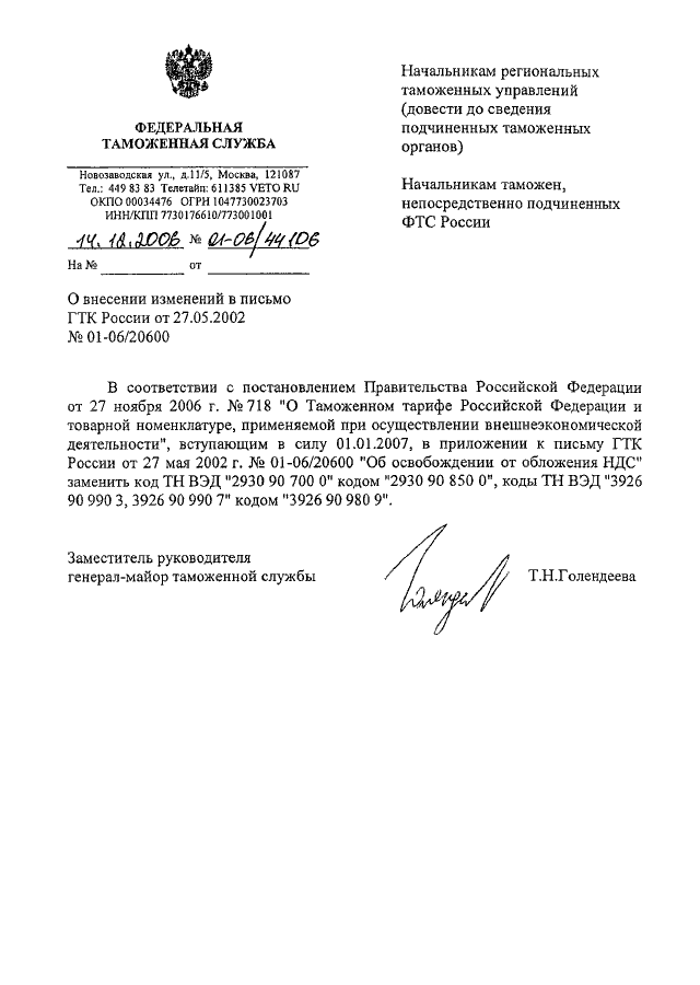 "О ВНЕСЕНИИ ИЗМЕНЕНИЙ В ПИСЬМО ГТК РОССИИ ОТ 27.05.2002 N 01-06/20600"