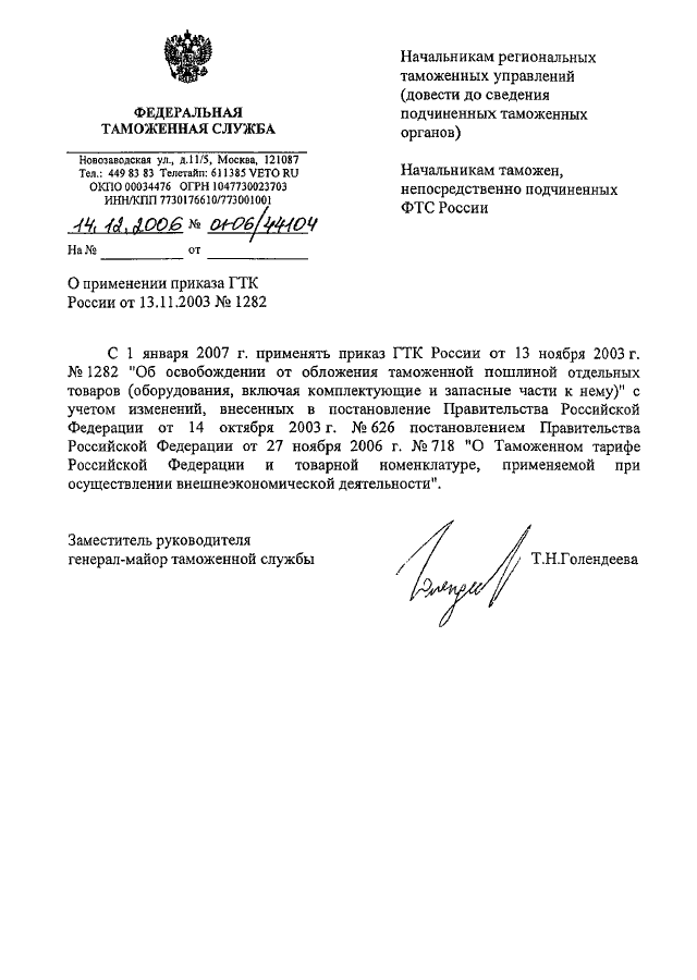 "О ПРИМЕНЕНИИ ПРИКАЗА ГТК РОССИИ ОТ 13.11.2003 N 1282"