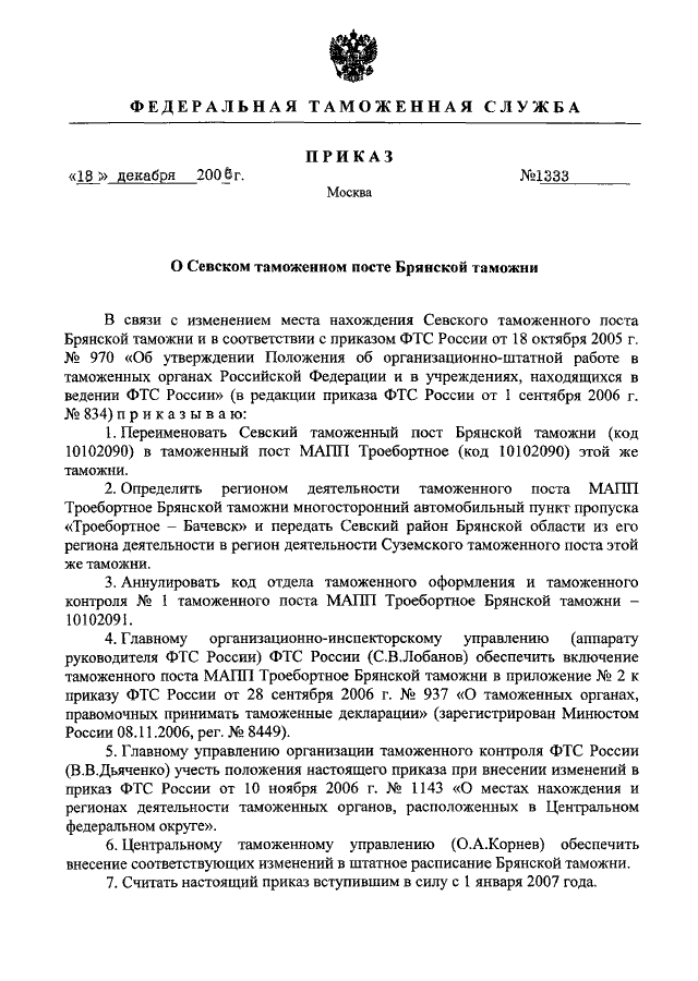 ПРИКАЗ ФТС РФ от 18.12.2006 N 1333