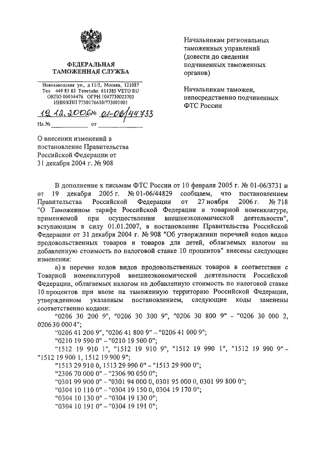 ПИСЬМО ФТС РФ от 19.12.2006 N 01-06/44733