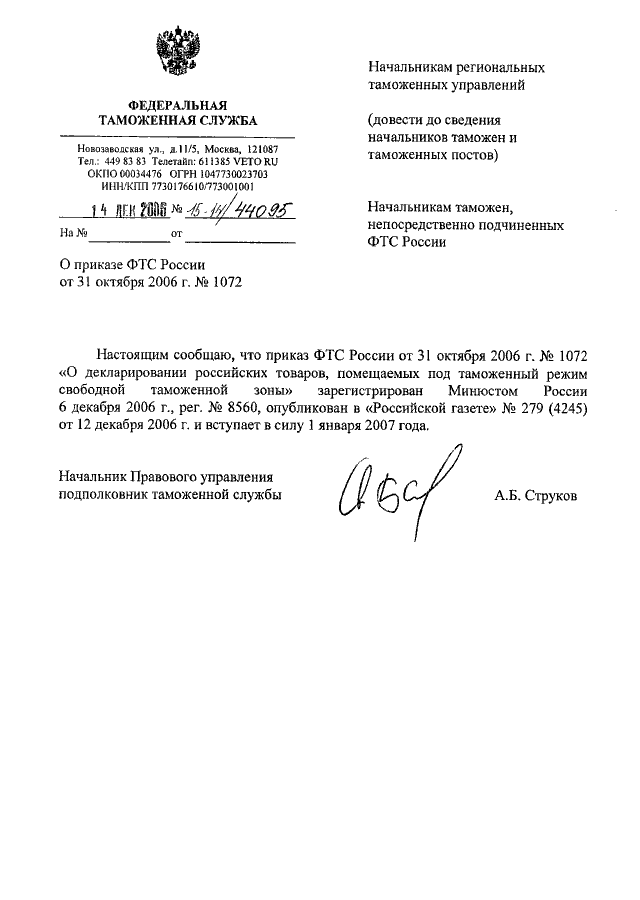 "О ПРИКАЗЕ ФТС РОССИИ ОТ 31 ОКТЯБРЯ 2006 Г. N 1072"
