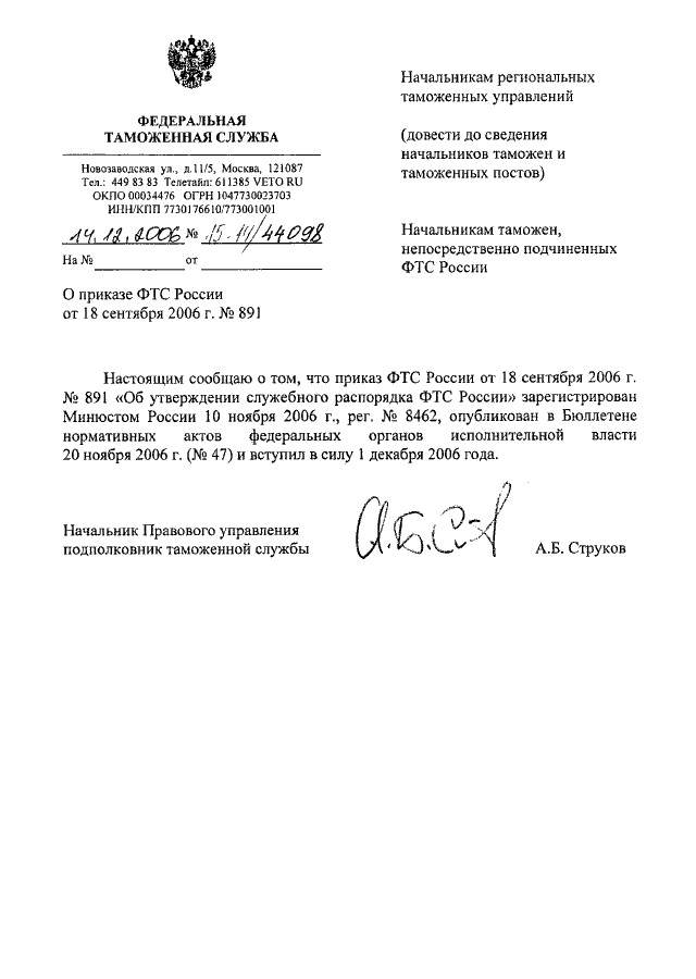 "О ПРИКАЗЕ ФТС РОССИИ ОТ 18 СЕНТЯБРЯ 2006 Г. N 891"