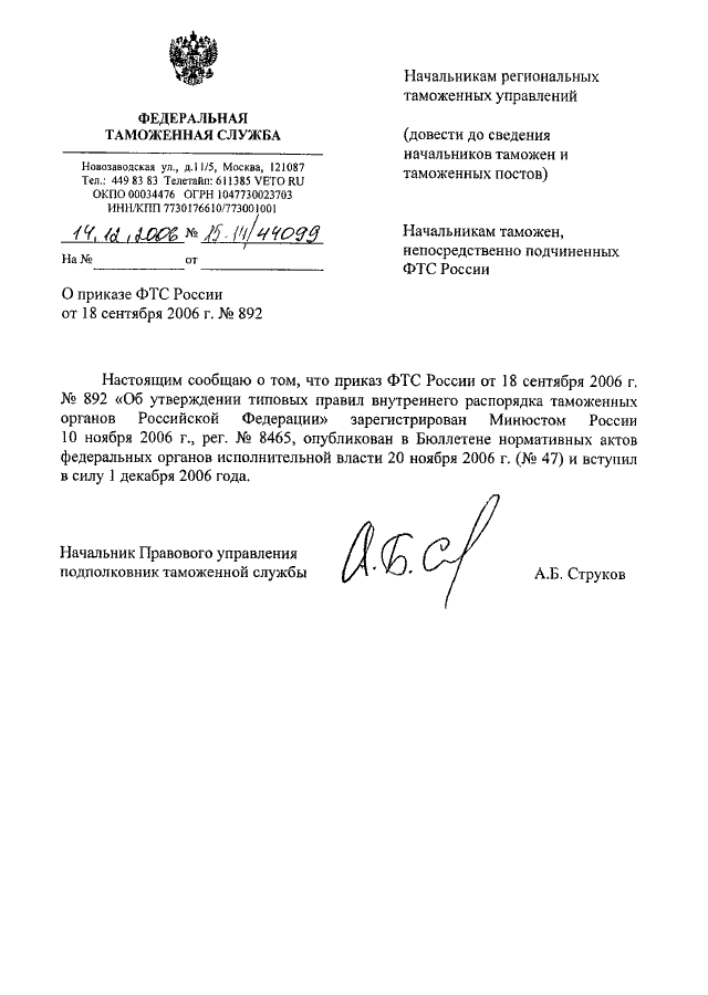 "О ПРИКАЗЕ ФТС РОССИИ ОТ 18 СЕНТЯБРЯ 2006 Г. N 892"