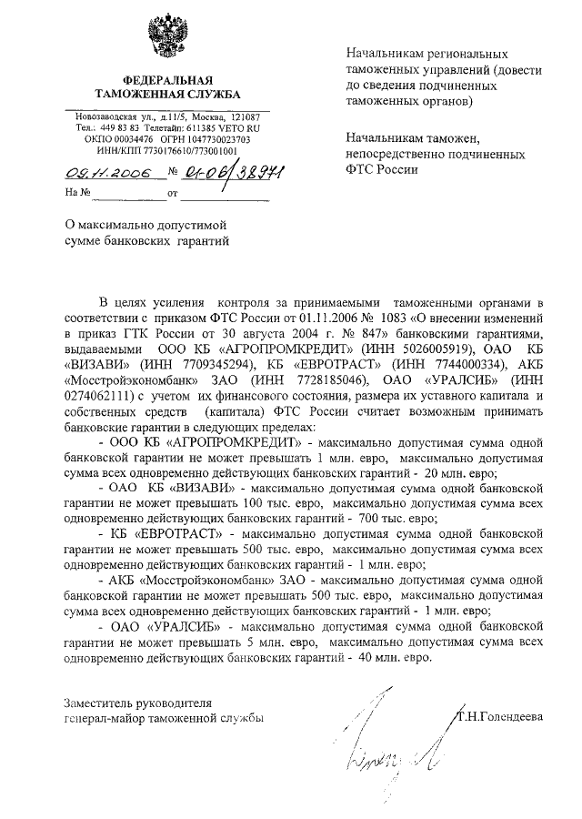ПИСЬМО ФТС РФ от 09.11.2006 N 01-06/38971