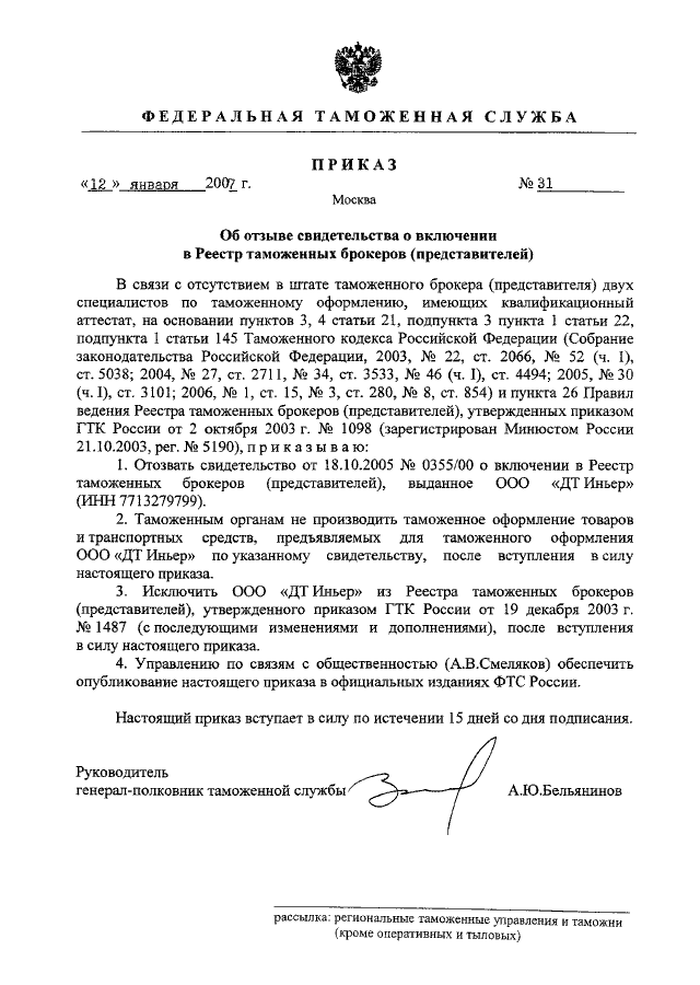 ПРИКАЗ ФТС РФ от 12.01.2007 N 31