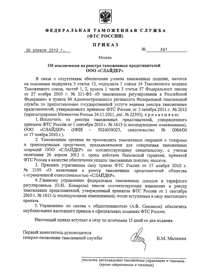 ПРИКАЗ ФТС РФ от 30.04.2013 N 861