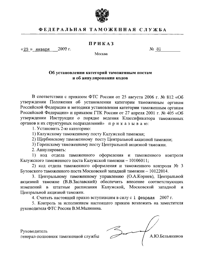 ПРИКАЗ ФТС РФ от 23.01.2007 N 81