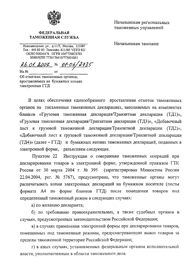 "ОБ ОТМЕТКАХ ТАМОЖЕННЫХ ОРГАНОВ, ПРОСТАВЛЯЕМЫХ НА БУМАЖНЫХ КОПИЯХ ЭЛЕКТРОННЫХ ГТД"