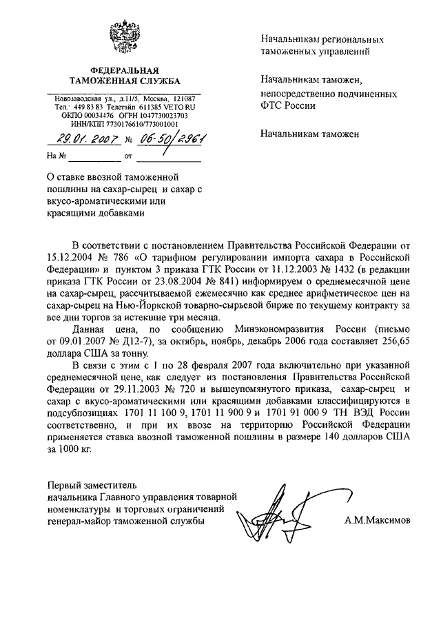 ПИСЬМО ФТС РФ от 29.01.2007 N 06-50/2961