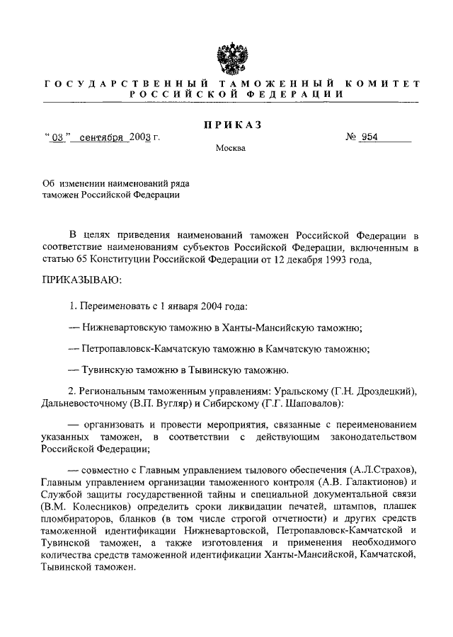 ПРИКАЗ ГТК РФ от 03.09.2003 N 954
