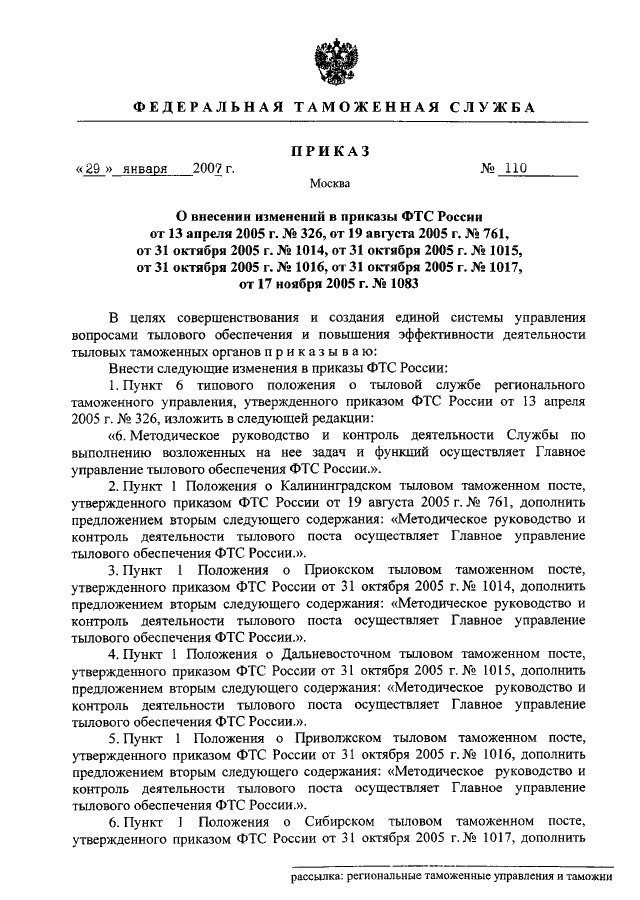 ПРИКАЗ ФТС РФ от 29.01.2007 N 110 "О ВНЕСЕНИИ ИЗМЕНЕНИЙ В ПРИКАЗЫ ФТС РОССИИ ОТ 13 АПРЕЛЯ 2005 Г.