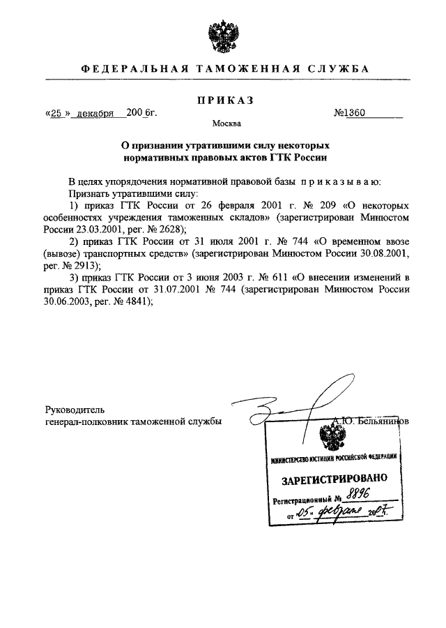 ПРИКАЗ ФТС РФ от 25.12.2006 N 1360