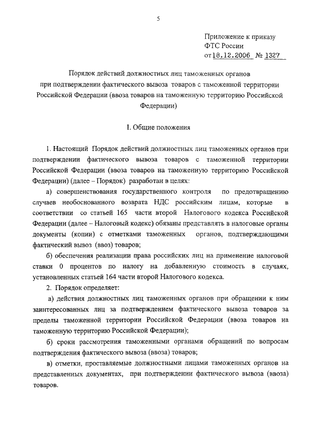 ПРИКАЗ ФТС РФ от 18.12.2006 N 1327