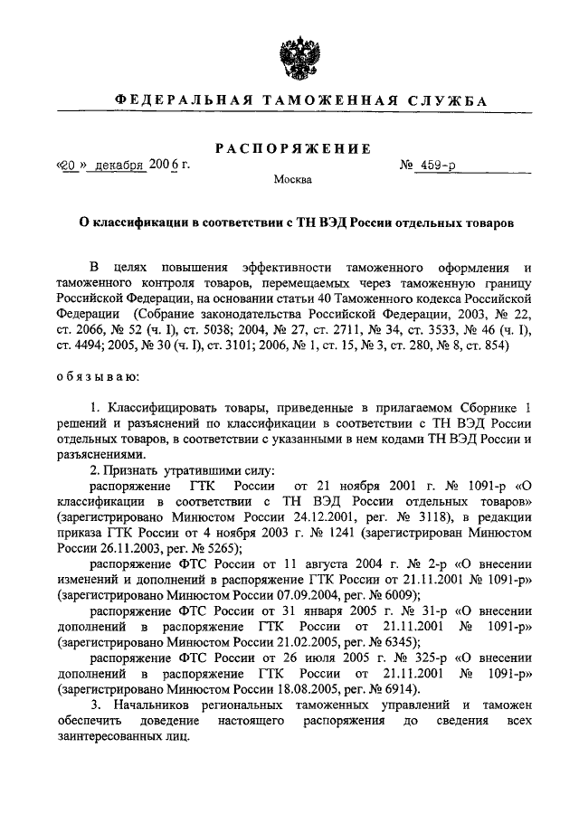 РАСПОРЯЖЕНИЕ ФТС РФ от 20.12.2006 N 459-р