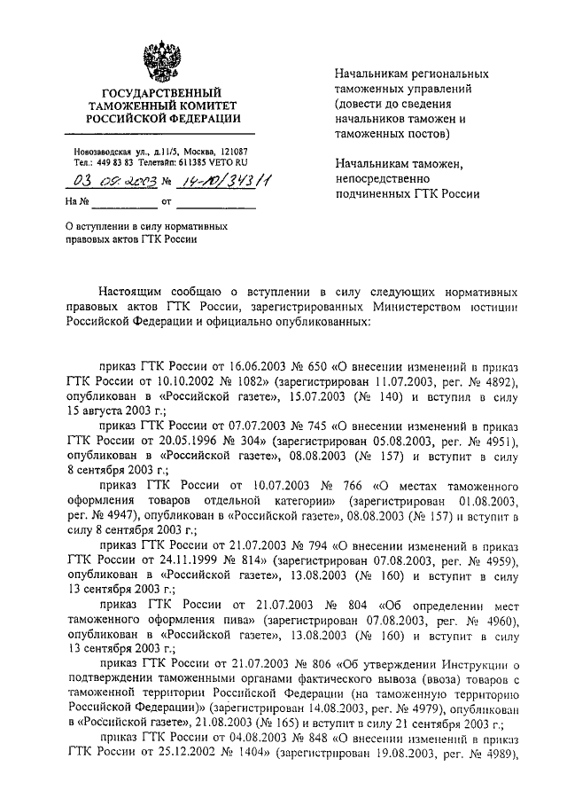 ПИСЬМО ГТК РФ от 03.09.2003 N 14-10/34311