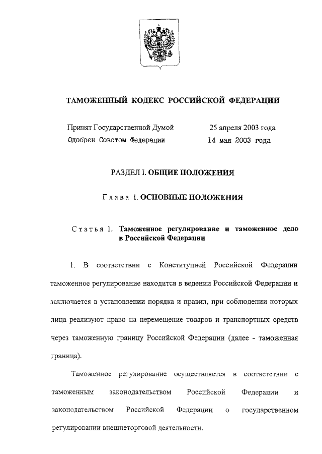 "ТАМОЖЕННЫЙ КОДЕКС РОССИЙСКОЙ ФЕДЕРАЦИИ"