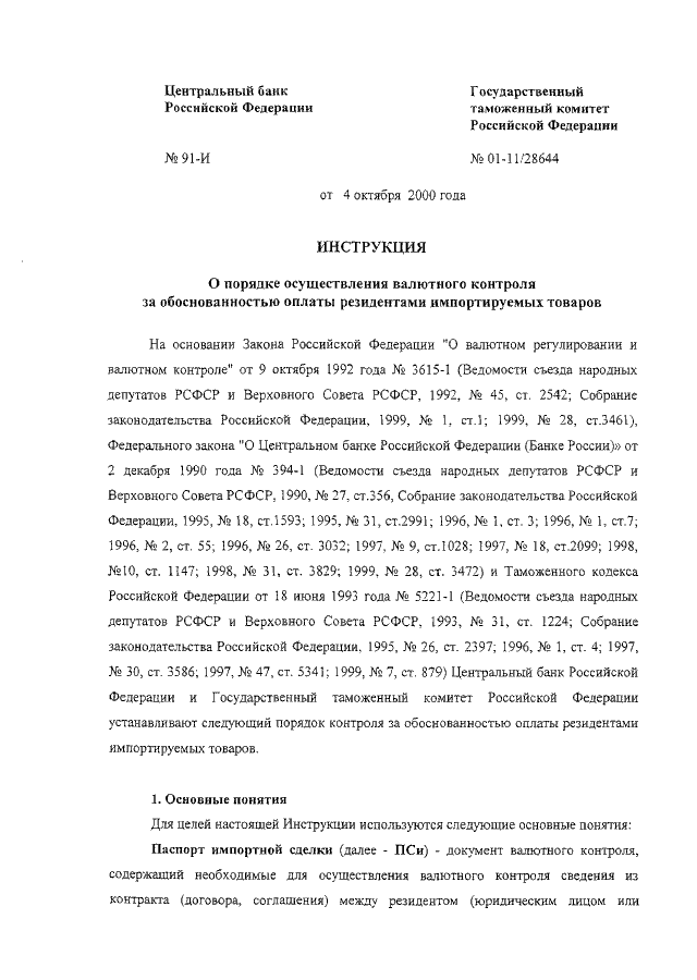 ИНСТРУКЦИЯ ЦБ РФ N 91-И, ГТК РФ N 01-11/28644 от 04.10.2000