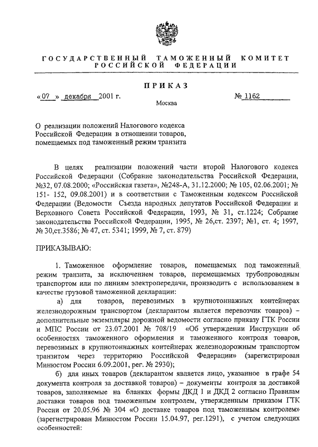 ПРИКАЗ ГТК РФ от 07.12.2001 N 1162