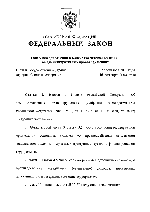 "О ВНЕСЕНИИ ДОПОЛНЕНИЙ В КОДЕКС РОССИЙСКОЙ ФЕДЕРАЦИИ ОБ АДМИНИСТРАТИВНЫХ ПРАВОНАРУШЕНИЯХ"