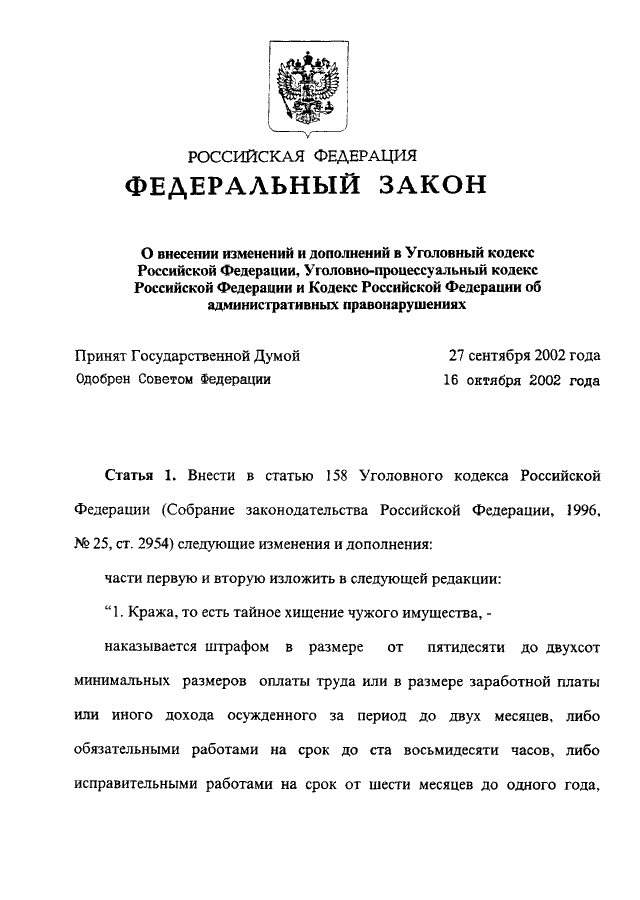 "О ВНЕСЕНИИ ИЗМЕНЕНИЙ И ДОПОЛНЕНИЙ В УГОЛОВНЫЙ КОДЕКС РОССИЙСКОЙ ФЕДЕРАЦИИ, УГОЛОВНО - ПРОЦЕССУАЛЬНЫЙ КОДЕКС РОССИЙСКОЙ ФЕДЕРАЦИИ И КОДЕКС РОССИЙСКОЙ ФЕДЕРАЦИИ ОБ АДМИНИСТРАТИВНЫХ ПРАВОНАРУШЕНИЯХ"